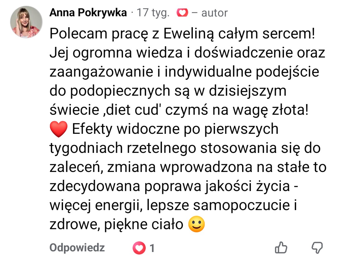 Schudła 12 kg w 3 mc, ale największą zmianą była poprawa snu i brak jedzenia w nocy.